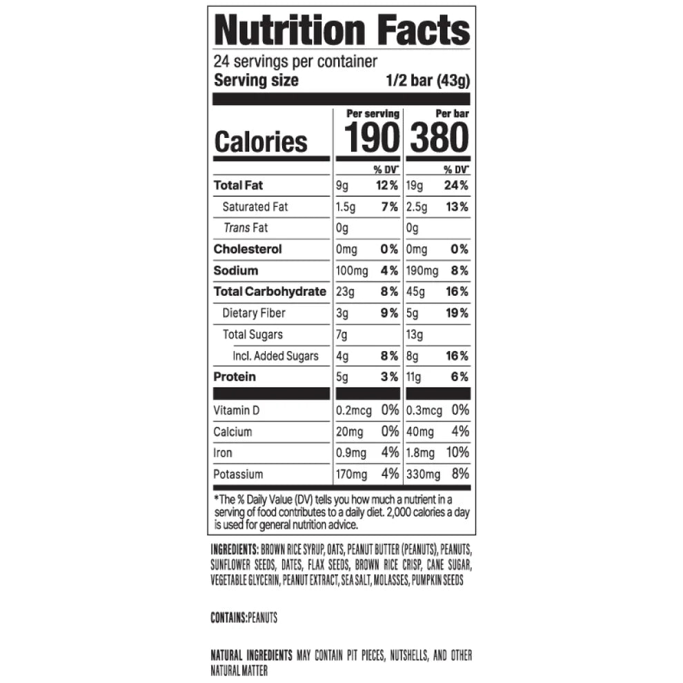 Our Peanut Butter MEAL bar delivers the pure, simple, and fresh from the jar taste you crave of natural peanut butter. Sometimes you don’t have time to make a full meal, but still need the energy to sustain you through your workout or get you through your busy day until dinner. Make this your favorite meal on the go for when you want the classic taste of natural peanut butter and fresh oats, but need the whole food goodness that comes from 11g of protein and nutrient-dense calories.
