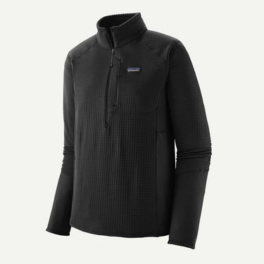 Light and packable, the hybridized R1 Pullover is a versatile midlayer for cool days in the mountains and everything in between. Polartec Power Grid fabrics offer outstanding stretch and durability, making this breathable fleece a technical all-arounder. Made in a Fair Trade Certified factory. | Patagonia Men's R1 Fleece Midlayer Pullover in Black, XS - Mid Layers - Recycled Polyester/Spandex