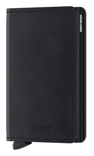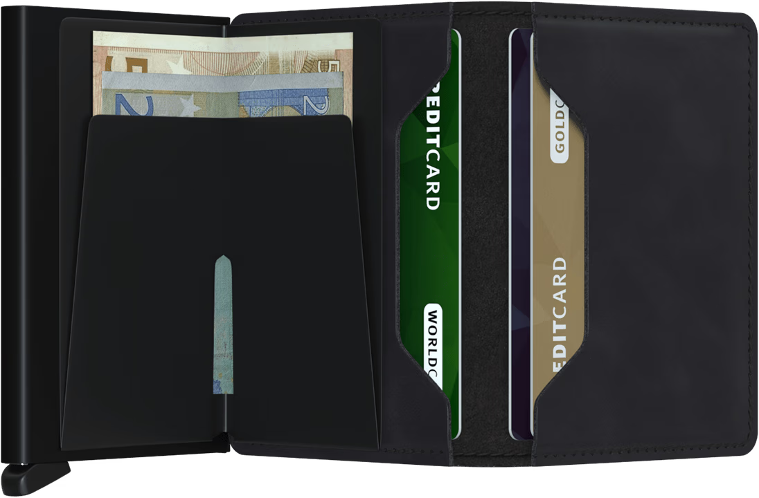 The Slimwallet is a modern take on the classic billfold. Its extra slim profile, without a button or magnet closure system, fits perfectly into every pocket. The generously cut leather holds at least six additional cards, banknotes and business cards. The open exterior is designed extra wide to accommodate cards, banknotes and receipts. The Cardprotector mechanism enables you to slide out cards with a simple motion, while the aluminium construction protects your cards from bending, breaking and unwanted wireless communication.